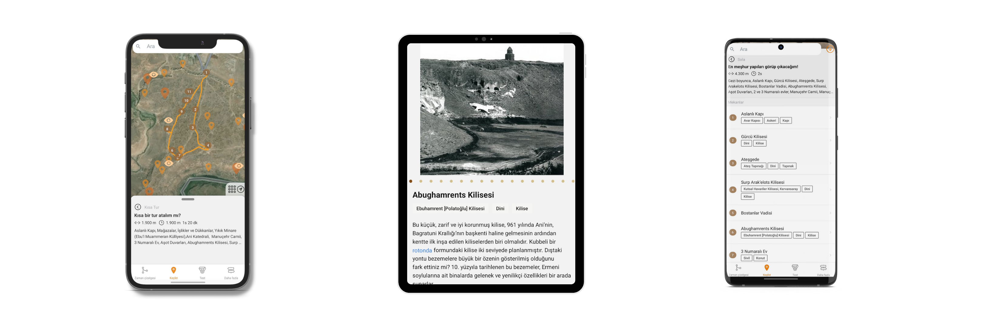 Keşfet: Farklı yapıların Ani içindeki konumları temel alınarak oluşturulan dört ana rota kullanıcılara Ani Arkeolojik Alanı’nı belli temalar üzerinden ziyaret etme ve deneyimleme imkânı sağlıyor.